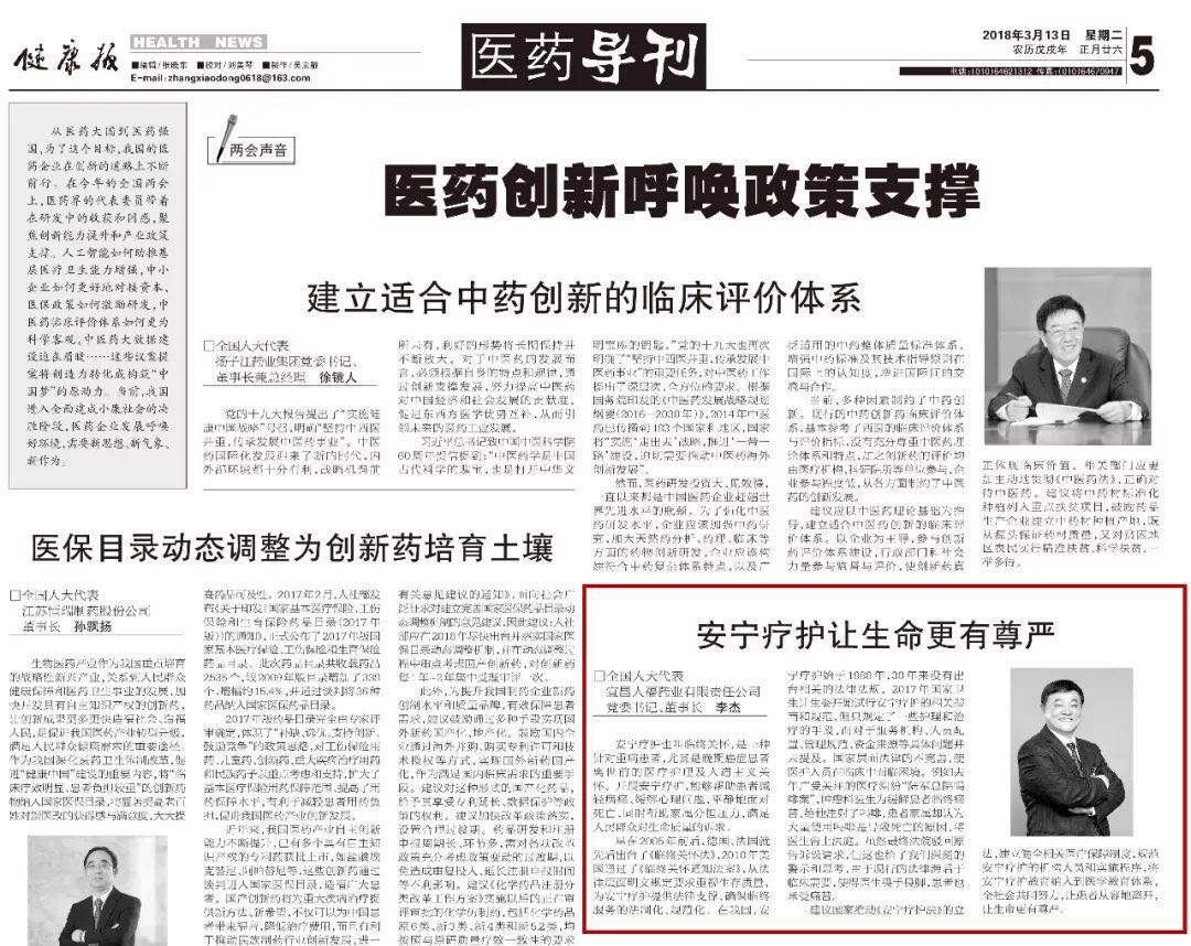 如何更好地实施临终关怀,帮助病人减少临终前的痛苦?全国人大代表,bwin·必赢集团股份公司总裁,宜昌人福药业有限责任公司党委书记、董事长李杰建议推动《安宁疗护法》立法,进一步规范安宁疗护的标准和管理制度,帮助病人有质量有尊严地度过生命的最后时光。该建议受到媒体积极关注,并先后在中国新闻网、《健康报》登出。